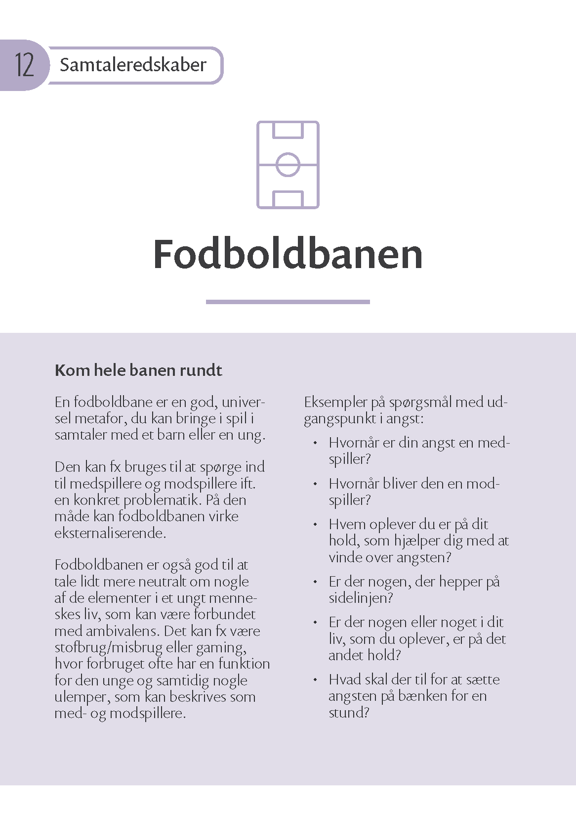 En fodboldbane er en god, universel metafor, du kan bringe i spil i samtaler med et barn eller en ung. Den kan fx bruges til at spørge ind til medspillere og modspillere ift. en konkret problematik. På den måde kan fodboldbanen virke eksternaliserende.